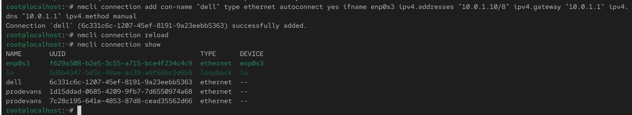 nmcli connection add con-name "dell" type ethernet autoconnect yes ifname enp0s3 ipv4.addresses "10.0.1.10/8" ipv4.gateway "10.0.1.1" ipv4.dns "10.0.1.1" ipv4.method manual